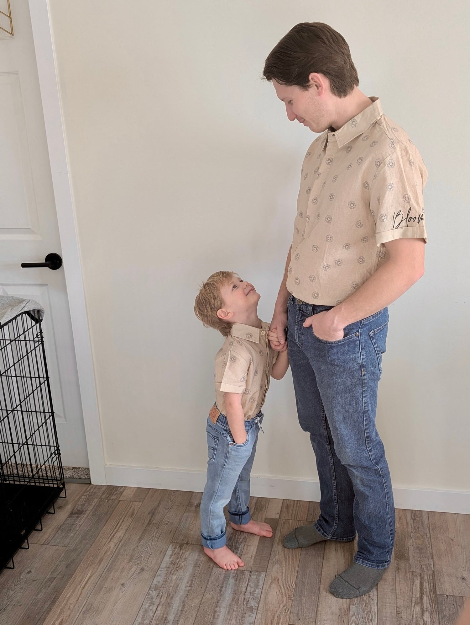 The matching button up shirts are really great. Love the hidden wooden button detail. The shirt is a thinner material that is not rigid so that will be nice for summer, the color is a great neutral beige and the micro flower detail is such a nice design. Fits true to size!
